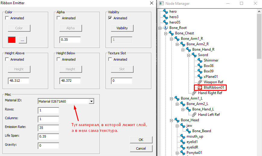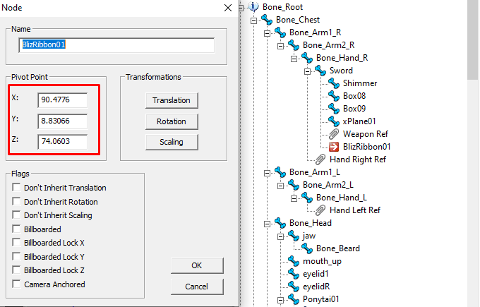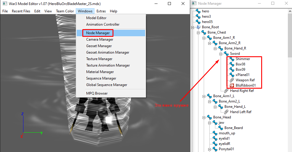 В Node Manager - это в War3ModelEditor, находим кость оружия и смотрим на её иерархию: