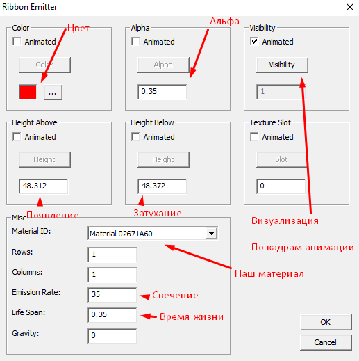 Запоминаем или записываем моменты начала и конца взмаха оружия. В редакторе эффекта нужно задать анимацию для визуализации: