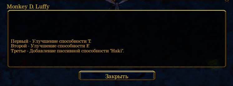 - Второй магазин - продает предметы, которые можно купить за 5 ед. дерева(дающие за каждое убийство), их можно купить лишь один раз. Каждый предмет или свиток - улучшает способность/усиливает/прибавляет характеристики или добавляет новые способности. Чтобы узнать, что дает тот или иной свиток, можно почитать в вкладках ''Задания''. К примеру список улучшений персонажа - Monkey D. Luffy.