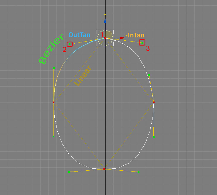 Те, кто работал со сплайнами в 3DS Max, вполне могут провести параллель с кривыми Безье, которые широко используются в нём. Направляющие (2 и 3 на 2.0.1) – это те самые две жёлтые линии с зелёными вершинами на концах. Именно они определяют характер кривой, проводимой между входящей направляющей одной вершины и выходящей направляющей другой.