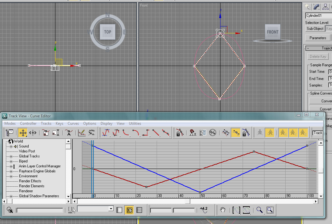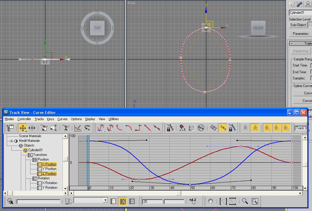 Сделав анимацию маятника с помощью линейной интерполяции, я меняю её тип на сплайновый. И тут же встречаюсь с проблемами в начальном и конечном кадре, но в данном случае она исправима довольно простым путём. Так как в анимации происходит 3 движения маятника, одно из них приходится на центр анимации, и, настроив его (Натяжение: -100; Целостность: 0; Наклон: -50) я через w3me 1.07 копирую значения координат вращения, InTan и OutTan начальному и конечному кадру, при этом меняя их значения на противоположные, тем самым получая повторяющуюся кривую, т. е. именно то, что мне и нужно (2.0.10).
