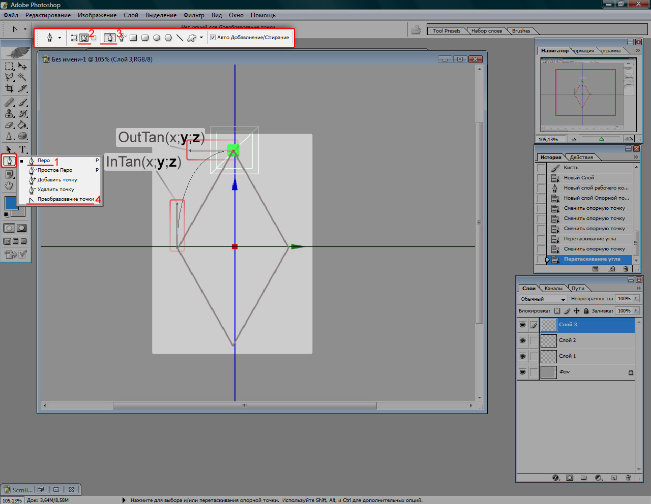 Для настройки InTan и OutTan нам необходимо узнать координаты направляющих, и здесь, как ни странно, нам придёт на помощь Photoshop (или любой другой редактор, работающий с кривыми Безье, даже MS Word). Установив расположение анимируемой кости во всех КК, я прямо на скриншоте из Mdlvis'а провёл между ними линии, характеризующие траекторию движения (ромб), и, используя инструмент Перо (п. 1 на 2.0.5), провёл линию между двумя точками ромба (верхней и левой), таким образом создав ту самую кривую Безье, которая и должна получиться!