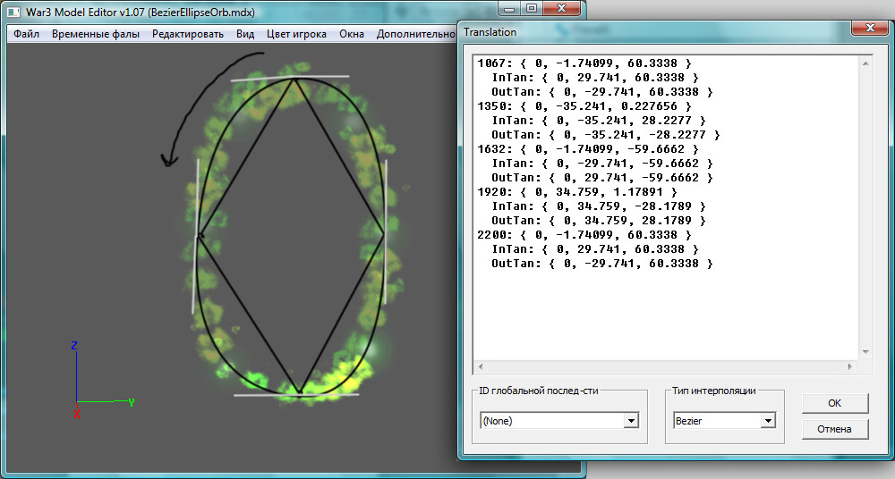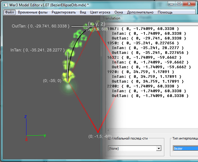 Такой тип контроллера строится на основе сплайна Эрмита, который я, к сожалению, пока, кроме WarCraft'а, нигде не встречал, и то, как у него рассчитывается кривая, как она зависит от направляющих, мне в большей степени непонятно. И узнать принцип его построения без редактора кривой Mdlvis’а мне выяснить, увы, не удалось, однако, как раз этот редактор кривой и спасает положение. Единственная его проблема – неотображаемость в некоторых кадрах (в 90% случаев в конечном, бывает и/или в начальном).