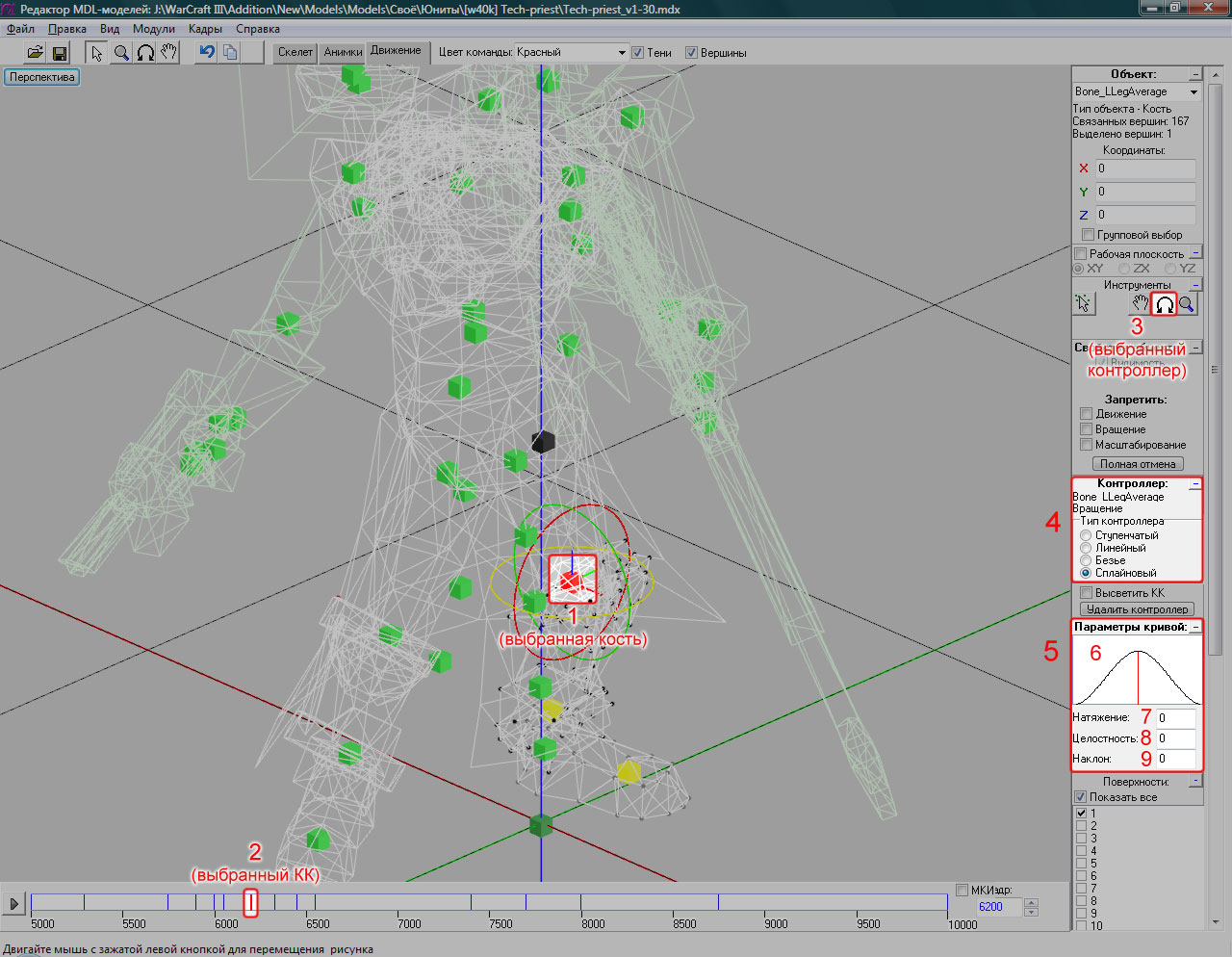 Теперь перейдём в Mdlvis, в Редактор анимаций на вкладку Движение, выберем кость, которую двигали и поставим тип контроллера перемещения – Безье. Пока никаких изменений заметно не будет (потому что направляющие имеют координаты, идентичные вершинам).