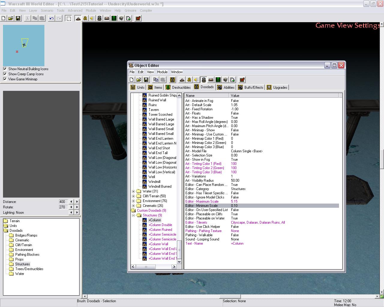 - Ей дается модель колонны или арки или еще чего, ставятся пониженные цвета (так декорации выглядит темнее, мы в подземелье, не забыли?), масштаб от 0.01 до 5.00, и убирается фоновый звук. Последний пункт важен как не знаю что, иначе весь ваш город будет шипеть факелами.