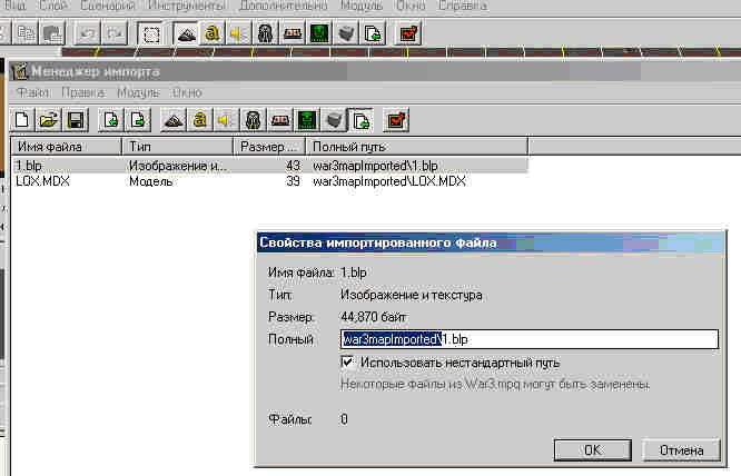 Открываем World Editor. Для TFT. Открываем импорт менеджер и импортируем всё из папки, куда сохранили модель. Потом два раза на импортнутые файлы, и ставим галочку использовать нестандартный путь, удаляем всё кроме названия.