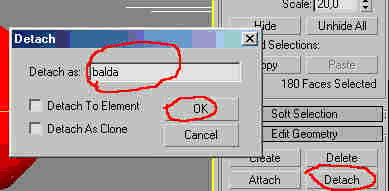 Теперь выберем голову, поставим галочку Ignore visible edges чуть ниже polygon. Один раз щёлкнем на голове - выделилась вся голова. Нажмём Deattach и в появившемся окне напишем BALDA! И жмём ОК