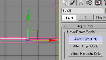 Для удобства можно переместить Pivot Point (точка, вокруг которой будет вращаться наша кость) так как показано на рисунке. И так со всеми костями. Для того, чтобы это сделать во вкладыше Hierarhy жмём кнопку affect pivot point onley. И перетаскиваем туда, куда надо. Теперь важный момент!