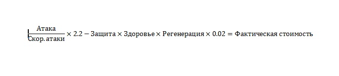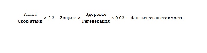 Итак, каждый юнит стоит определенное кол-во ресурсов. Понятное дело, что это "кол-во" зависит от определенных характеристик юнита. Таких характеристик довольно много, но в своих вычислениях я использовал не много, а именно атаку, скорость атаки, здоровье и его регенерацию, защиту, ману, скорость её восстановления. Оставшиеся скорость передвижения, дальность атаки и дальность обзора и т.д. я считаю не слишком важными для юнита, т.е. те, что влияют не так сильно на выносливость боевой единицы.