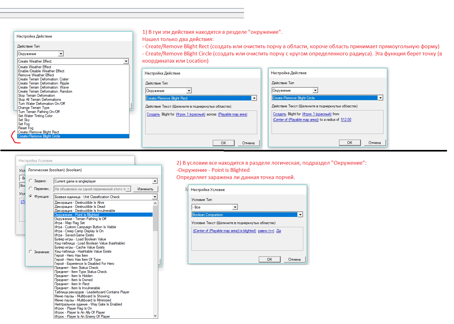 native IsPointBlighted takes real x, real y returns booleanКак и в WE порча привязана к сетке. SetBlightPoint создаёт никакой не point, а регион размером 512 на 512.