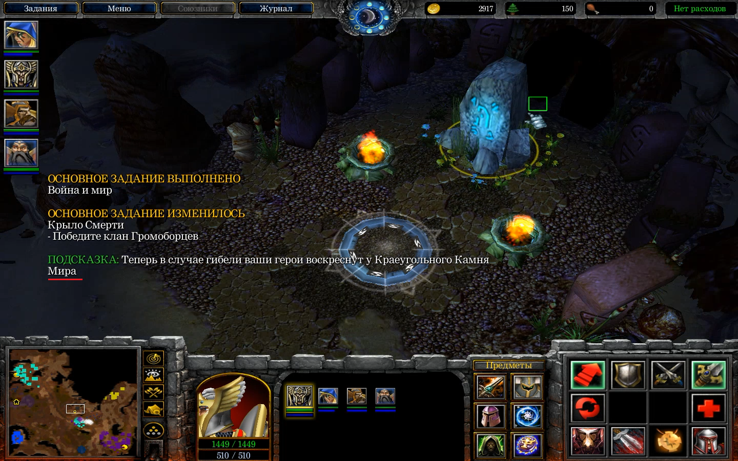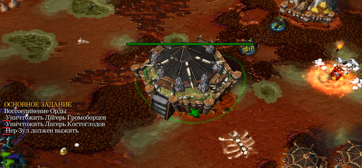 Сперва я укрепил собственный лагерь и расправился с нейтральными монстрами рядом с Громоборцами. Далее наняв войска и построив катапульты уничтожил все силы этой мятежной базы орков и освободил Грома Задиру. Теперь появился новый герой и дополнительный рудник.