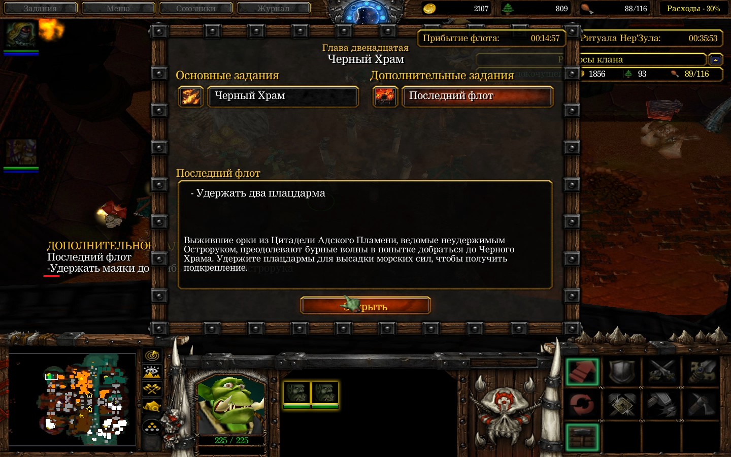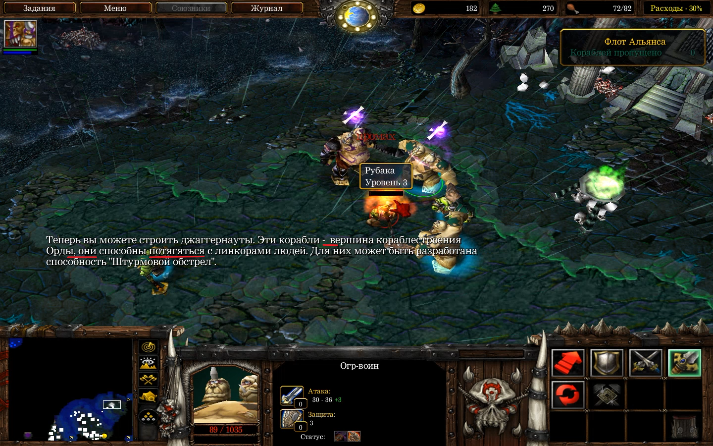 Практически сразу после уничтожения трёх поселений открылись ворота города людей и стартовал отсчёт 30 минут, по окончании которых прибыла бы флотилия Альянса. Вместе с этим ещё и начались достаточно неприятные атаки с двух вражеских баз. В добавок приплыл и вражеский флот, с которым тем не менее помог справиться прибывший отряд новых союзников: троллей и черепах.