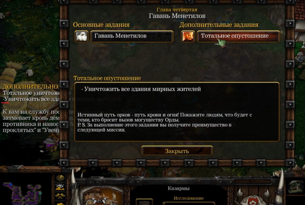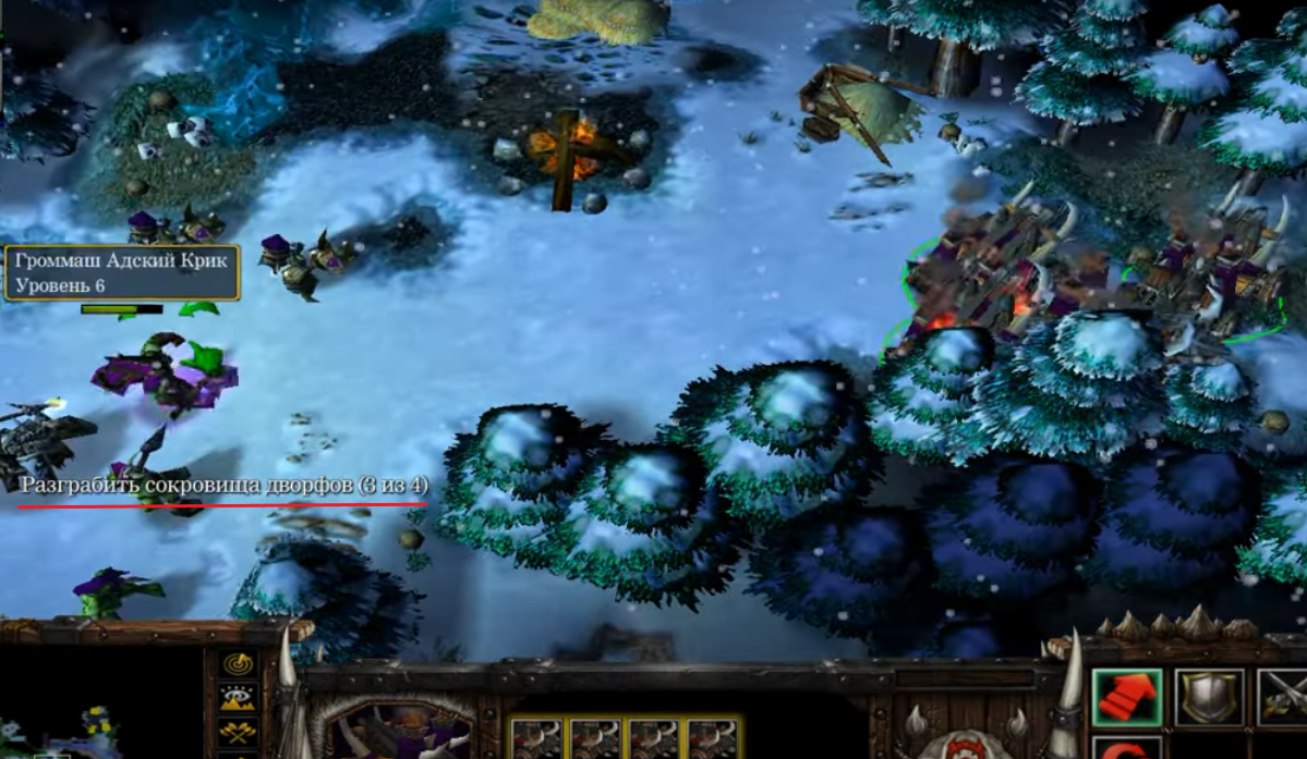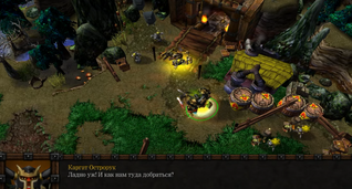 В самом начале я отправился в атаку на три поселения людей, которые не очень хорошо охранялись. Это было сделано не зря. В результате были захвачены дополнительные ресурсы, что стало неплохим подспорьем, особенно из-за того что золота в единственном доступном руднике на данный момент оказалось мало (менее 5 тыс.). Также после разрушения первого людского здания появилось дополнительное задание на уничтожение всех домов мирных жителей, которых насчитывалось более 50. При этом из построек выпадали золото и древесина.