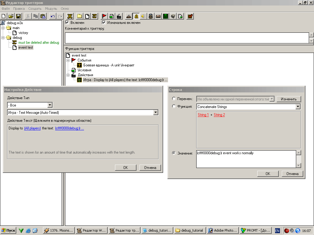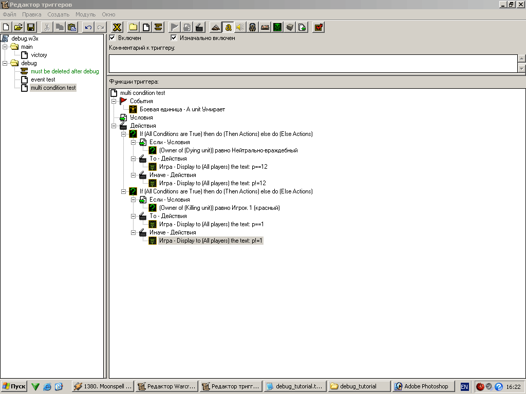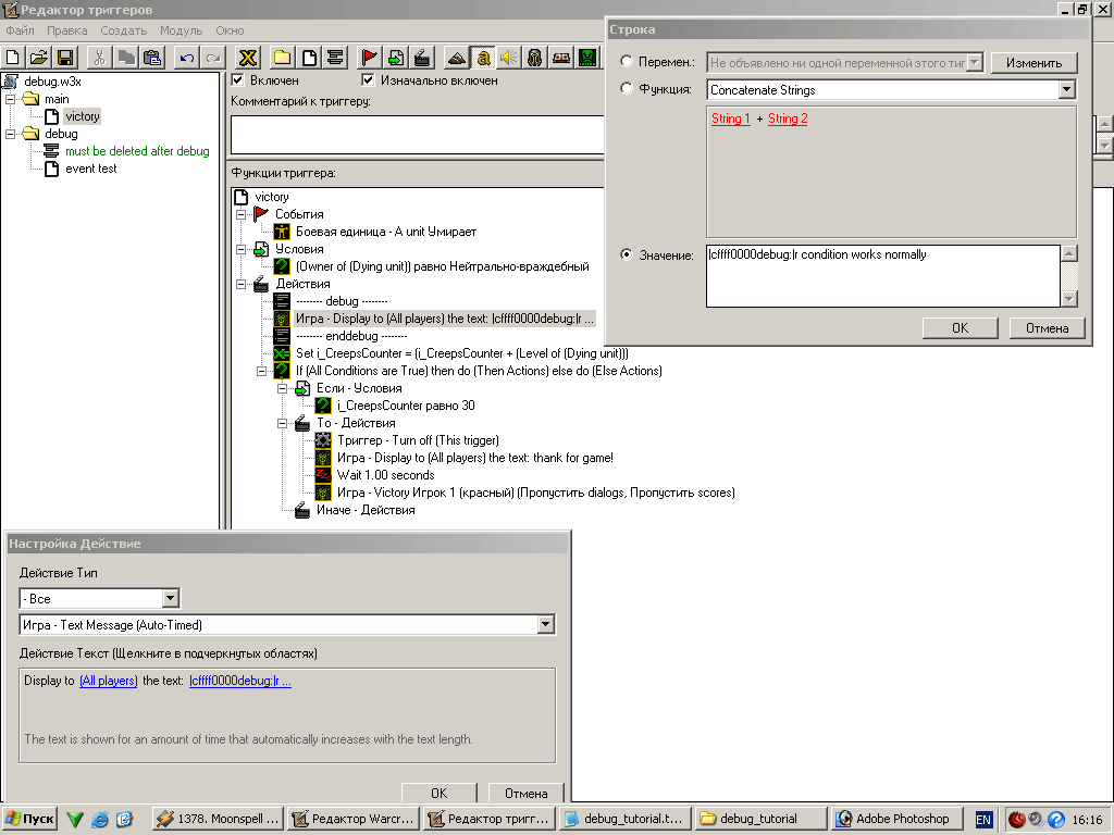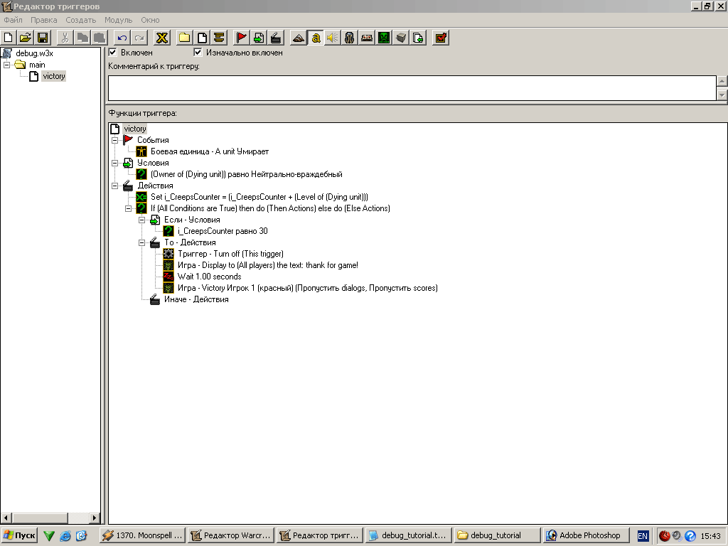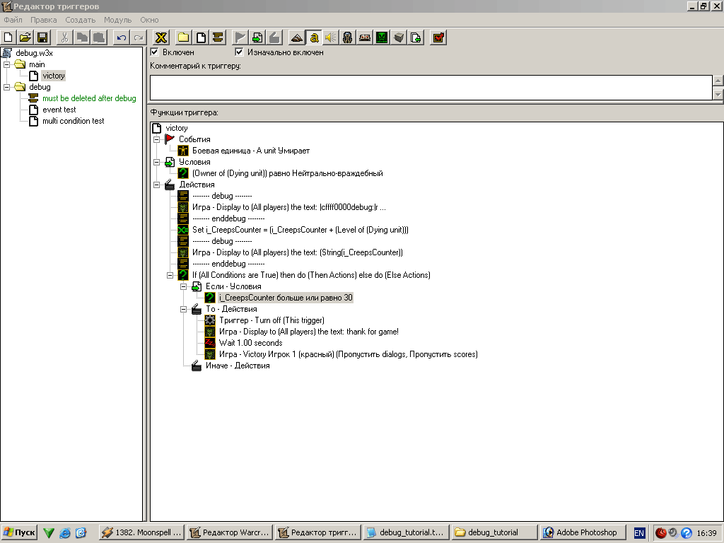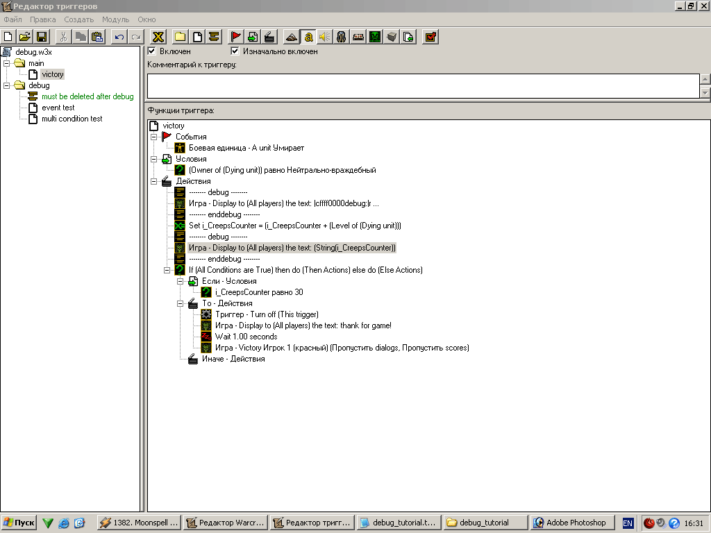 Ну вот, теперь победа объявляется всегда, когда игрок наберет достаточно очков. Еще раз повторю, что пример достаточно примитивный (придумать не примитивный, но применимый к триггерам я не смог) но вполне четко описывает данный метод. По сути мы можем только догадываться, о чем думает компьютер (какие значения в данный момент имеют переменные и какие инструкции он в данный момент исполняет), но мы можем попросить его рассказать нам об этом с помощью DeBug сообщений ;)