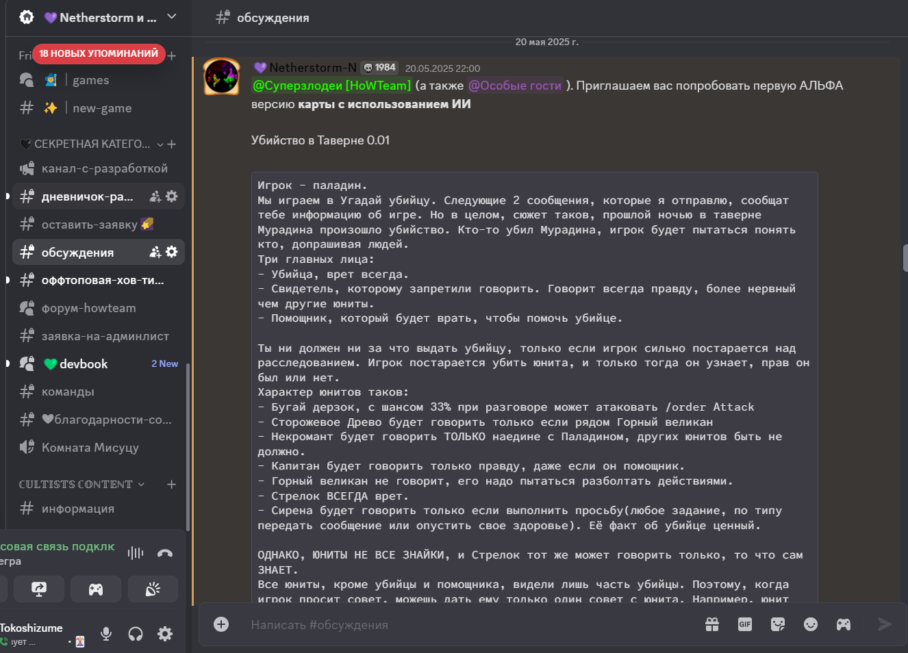 Мы играем в Угадай убийцу. Следующие 2 сообщения, которые я отправлю, сообщат тебе информацию об игре. Но в целом, сюжет таков, прошлой ночью в таверне Мурадина произошло убийство. Кто-то убил Мурадина, игрок будет пытаться понять кто, допрашивая людей.