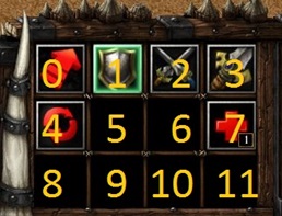 0-5 Кнопки предметов. Периодически обновляются, появляются при каждом изменении выбора юнита. Когда его родительский элемент виден.
