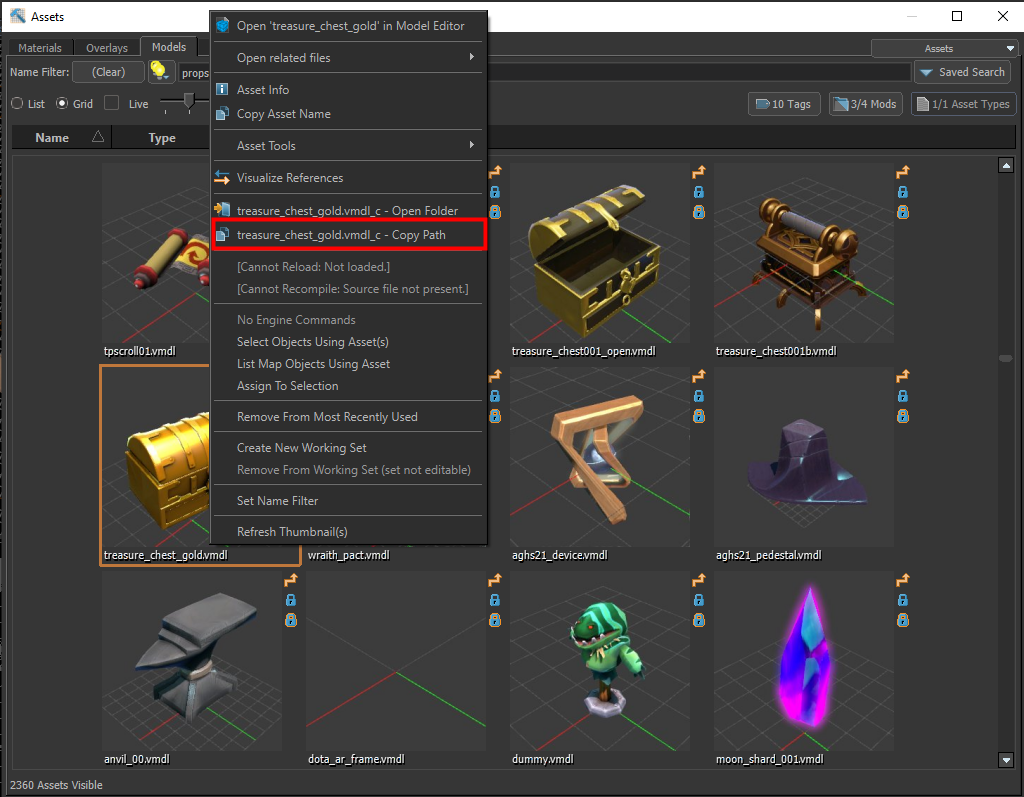 На момент написания этой статьи Dota 2 и её редактор Humer насчитывают 15000 ассетов моделей и 56000 эффектов, и это всё никак не защищено, можно брать для своих мелких, некоммерческих проектов. К сожалению я не буду тут всё расписывать и лишь только то, до чего дошел методом научного тыка.