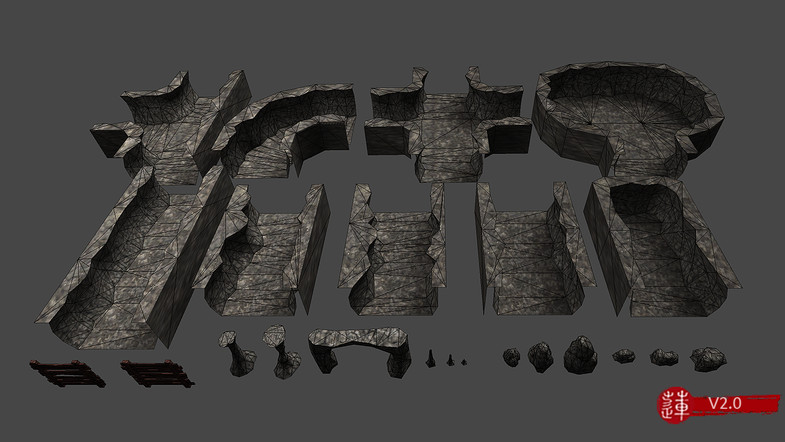 Набор декораций в помощь всем, кто делает уровни в подземельях, подойдёт для создания различных данжей. В набор входит 28 декораций и 4 текстуры к ним (каждая модель использует не больше 2 текстур). Туда входят сегменты для подземных ходов и отдельные декорации, вроде камней, арок, подпорных стенок и месторождений.