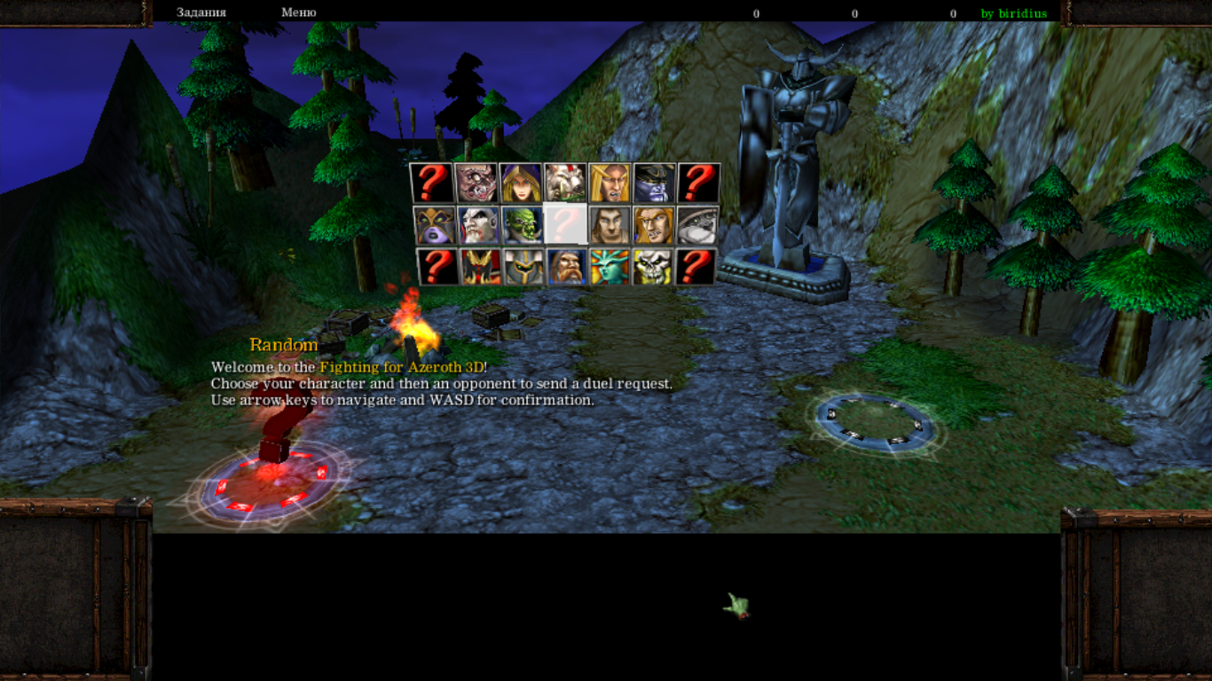 Выбор героя: стрелками, затем одну из W, A, S, D для подтверждения, и так же выбрать противника. Escape в меню - открыть доп. меню с выбором арены, режимами выживания и тренировки.