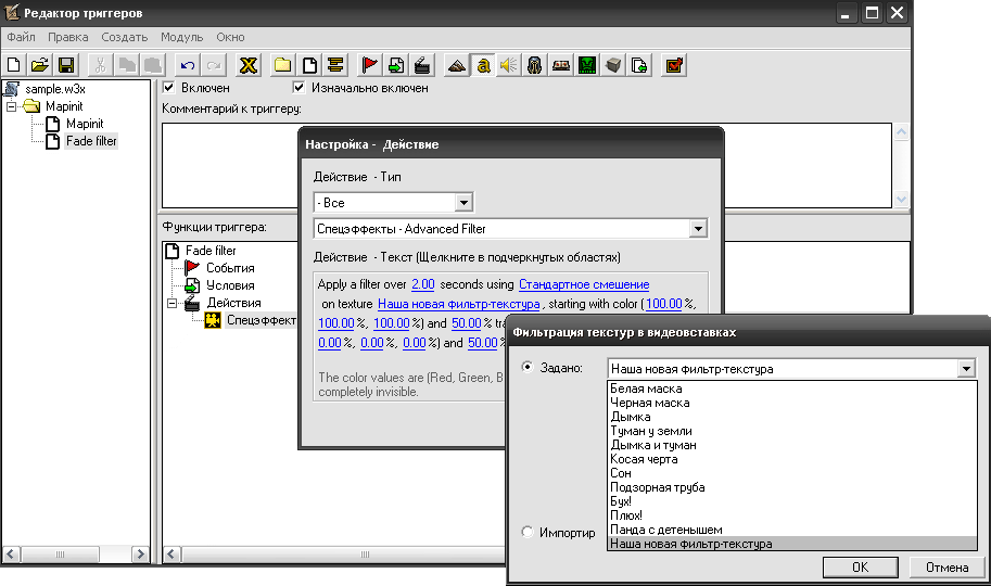 Еще разок обратим внимание на этот рисунок. Как видно, помимо списка стандартных эдиторных текстур под общим названием «Задано» есть еще снизу некий таинственный «Импортир». Дело в том, что в качестве текстуры для фильтра можно еще использовать любую импортированную текстуру. О том, как импортировать файлы в карту, сказано вот в этой статье: импорт файлов