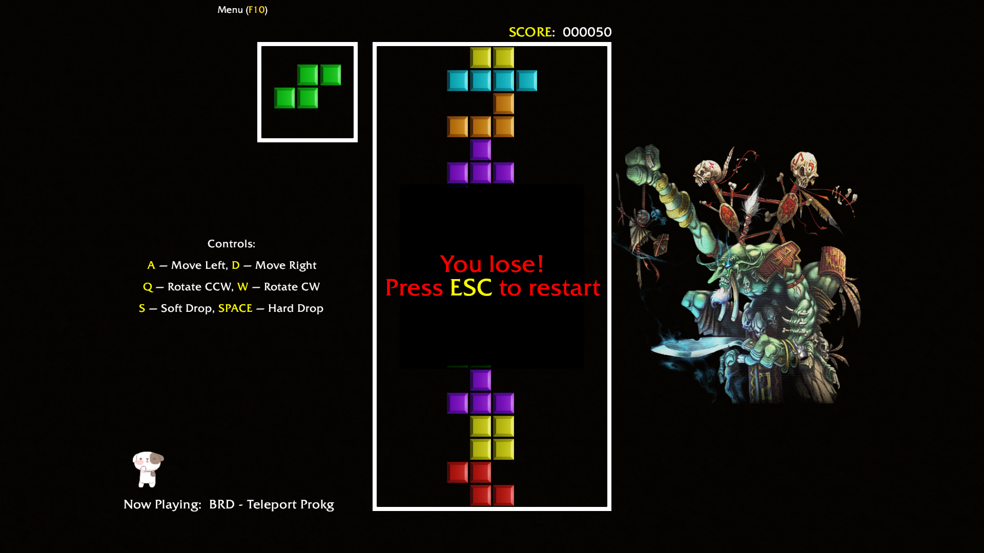 - Система подсчёта очков: +5 за каждую постановку фигуры, +50 за 1 уничтоженный ряд, +150 за 2 ряда, +350 за 3 ряда, +700 за 4 ряда.