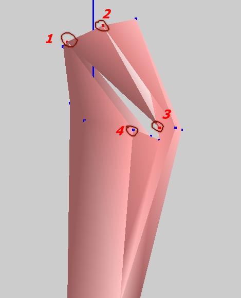 Затем начинаю формировать поверхность, прежде всего соединяю – сжимаю (кнопка 8) предварительно выделенные нужные точки. Получились ноги с огромными дырами, к тому же некоторые треугольники стоят неправильно. Должен сказать, что для проведения этих операций нужно хорошее пространственное мышление и ясное представление конечной цели, поэтому много объяснять не буду, приведу только пример: сначала передвижением точек, как было описано выше, формируем «каркас» ног в месте разрыва, затем осматриваем еще раз всю поверхность и видим, что треугольник 123 стоит неправильно, поэтому его необходимо удалить (кнопка 7) и создать новый треугольник 124 (кнопка 6).