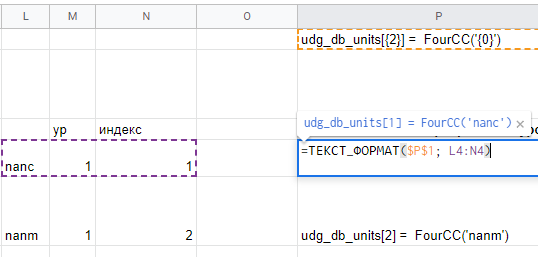 Помимо голвых данных, я для этой таблицы создал некоторые новые формулы. Например "ТЕКСТ_ФОРМАТ" для удобной штамповки строк кода. Первым аргументом в неё нужно залить шаблон строки кода, а вторым аргументом - список параметров, которые заменят значения от {0} до {n}