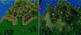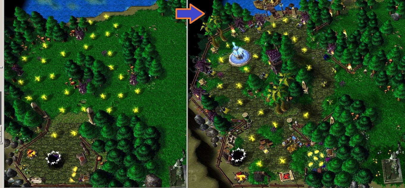 - Переработал ландшафт. Добавил неровностей, холмов и т.д. Утопил склоны на отмелях, получился плавный переход от суши к глубине. Добавил декораций, домов, травы, камней и пр. Перерисовал большую часть леса. Вот несколько скринов из редактора. Слева на картинке как было раньше(версия карты 1.31), а справа - как стало теперь(версия карты 1.4);