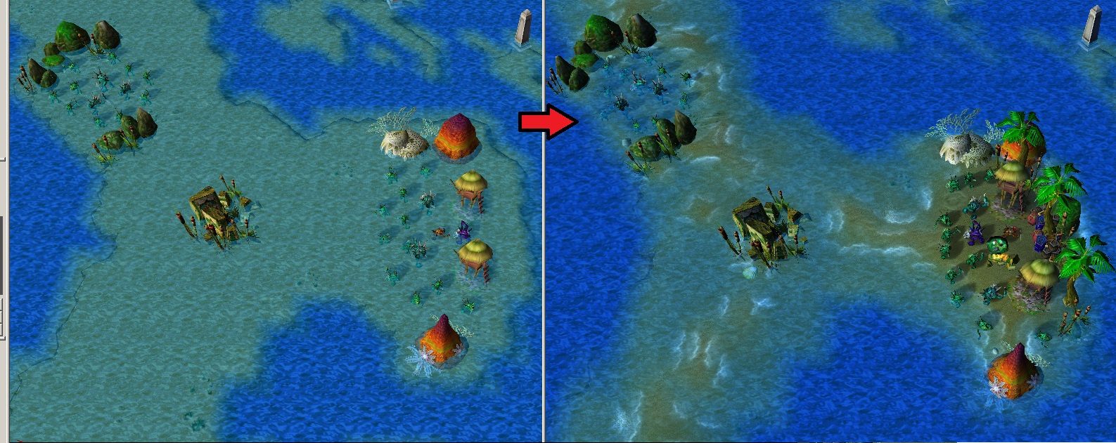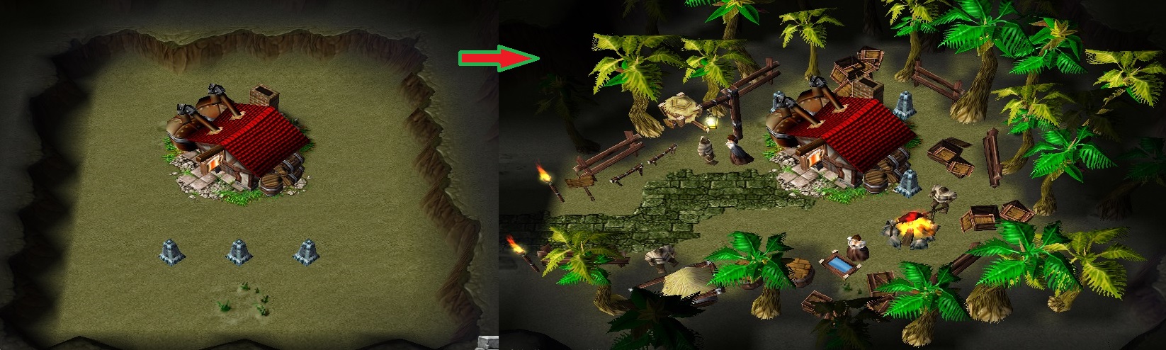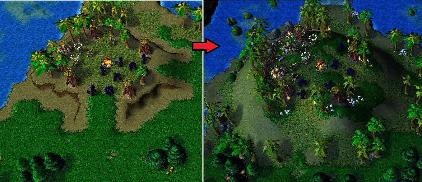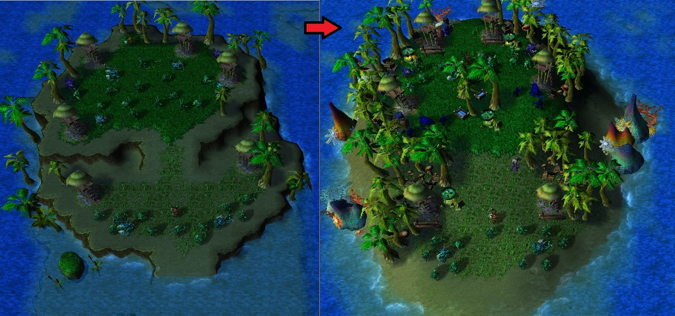 - Переработал ландшафт. Добавил неровностей, холмов и т.д. Утопил склоны на отмелях, получился плавный переход от суши к глубине. Добавил декораций, домов, травы, камней и пр. Перерисовал большую часть леса. Вот несколько скринов из редактора. Слева на картинке как было раньше(версия карты 1.31), а справа - как стало теперь(версия карты 1.4);