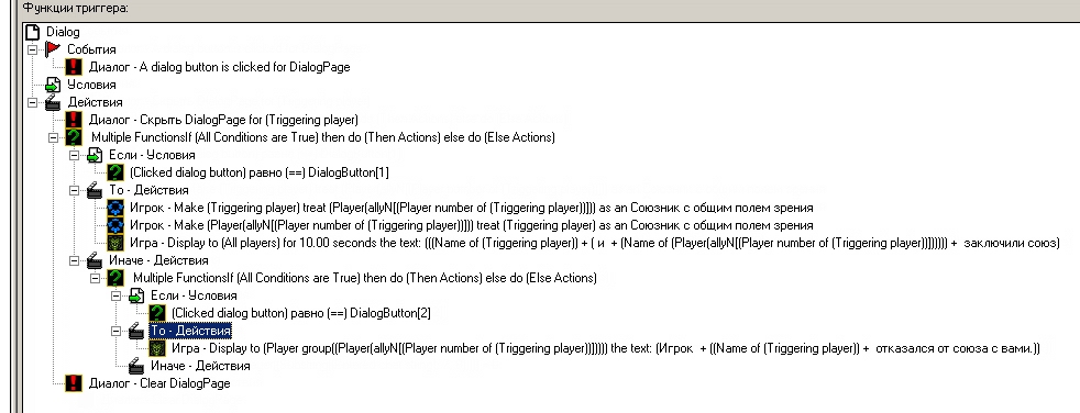 При вводе в чат команды, в переменную AlianceNumber заносится номер игрока, с которым мы хотим заключить или разорвать союз. Каждый игрок имеет в распоряжении 12 ячеек в переменной Ally[], отвечающей за отношение игрока к другим. В условиях прописаны позиции не реагирующие на попытки игрока заключить\разорвать союз с самим собой.