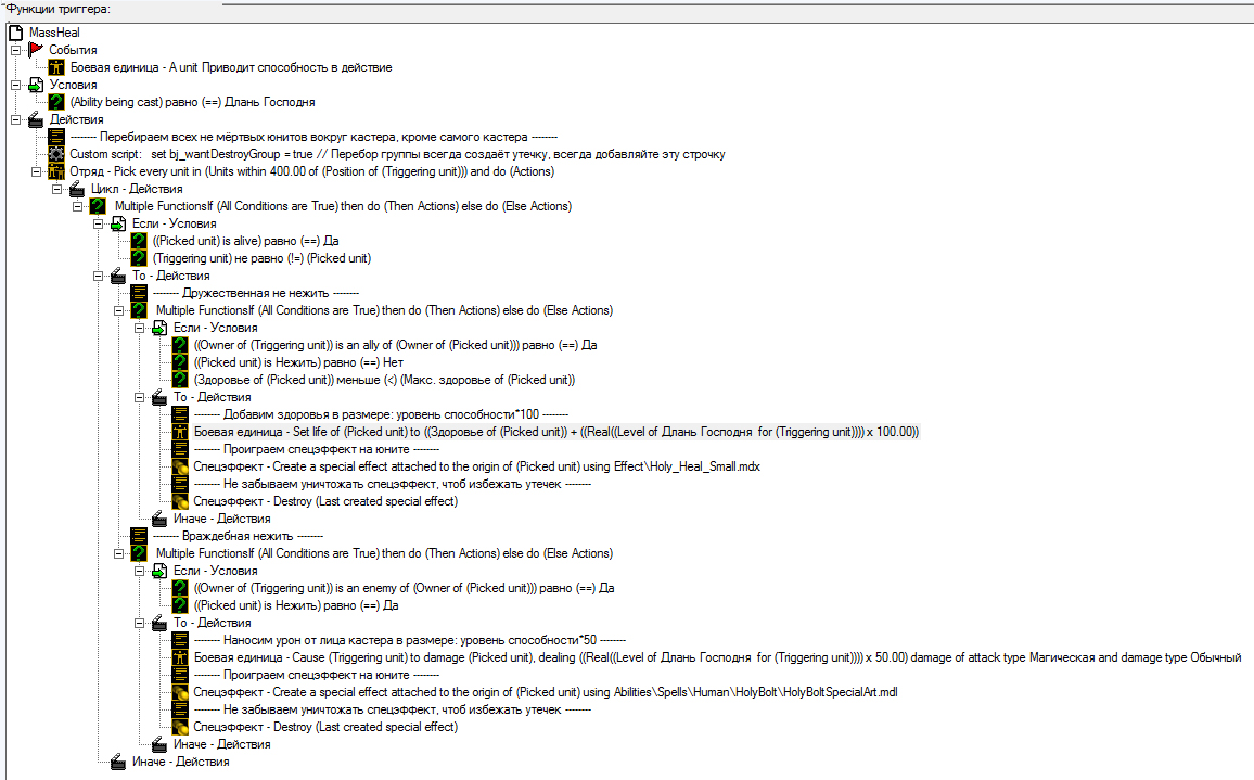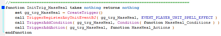 На этом можно и остановиться, но мы не ищем лёгких путей, и будем улучшать код дальше. В этом нам поможет vJass. Для начала отключим наш триггер и создадим новый, с назавнием SpellMassHeal и содержанием