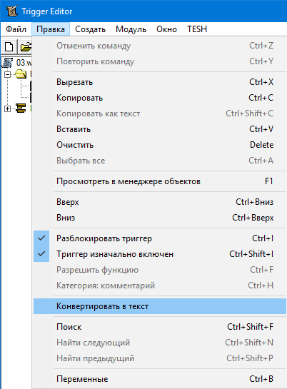 Что-бы перейти к освоению JASS, нажмём "Правка->Конвертировать в текст".