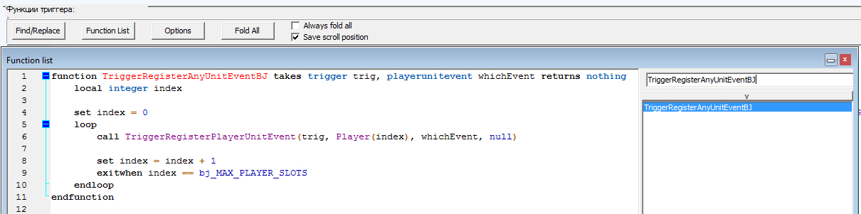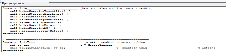 Так что, вооружившись знанием об локальных переменных, приведём код в порядок. Для начала вооружившись автозаменой по _Ctrl+H_ избавимся от ненужных приставок "Trig_". Стало немного читаемей, но редактор почему-то подсвечивает некоторые функции красным шрифтом.
