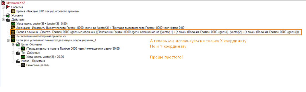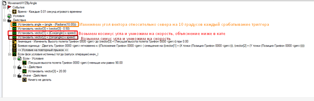 Получаемый вектор таким способом является единичным, то есть его длина равна 1-му, и следует, что дистанция между срабатываниями триггерами будет равна именно 1, а в варкрафте это 1 / 128 белой клетки, не дело совсем! Поэтому мы и помножим на скорость.