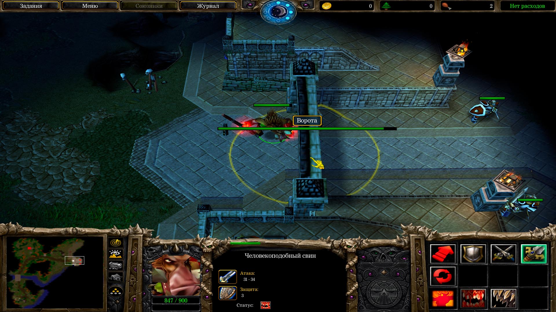 Тут и начинается основной геймплей карты. Хочу отметить, что геймплей умеренно хардкорный, что лично для меня, несомненно плюс. Из того, что вы просто вломитесь в толпу врагов, ничего хорошего не выйдет. Нужно не давать себя окружать, пользоваться разным расстоянием агрессивности крипов (хотя, иногда это выглядит как эксплойт багов, например, более ранний агр орков-разбойников-лучников, по сравнению с ближнебойными, из-за чего лучников легко убить).
