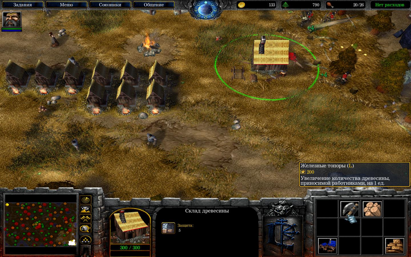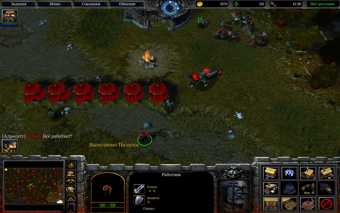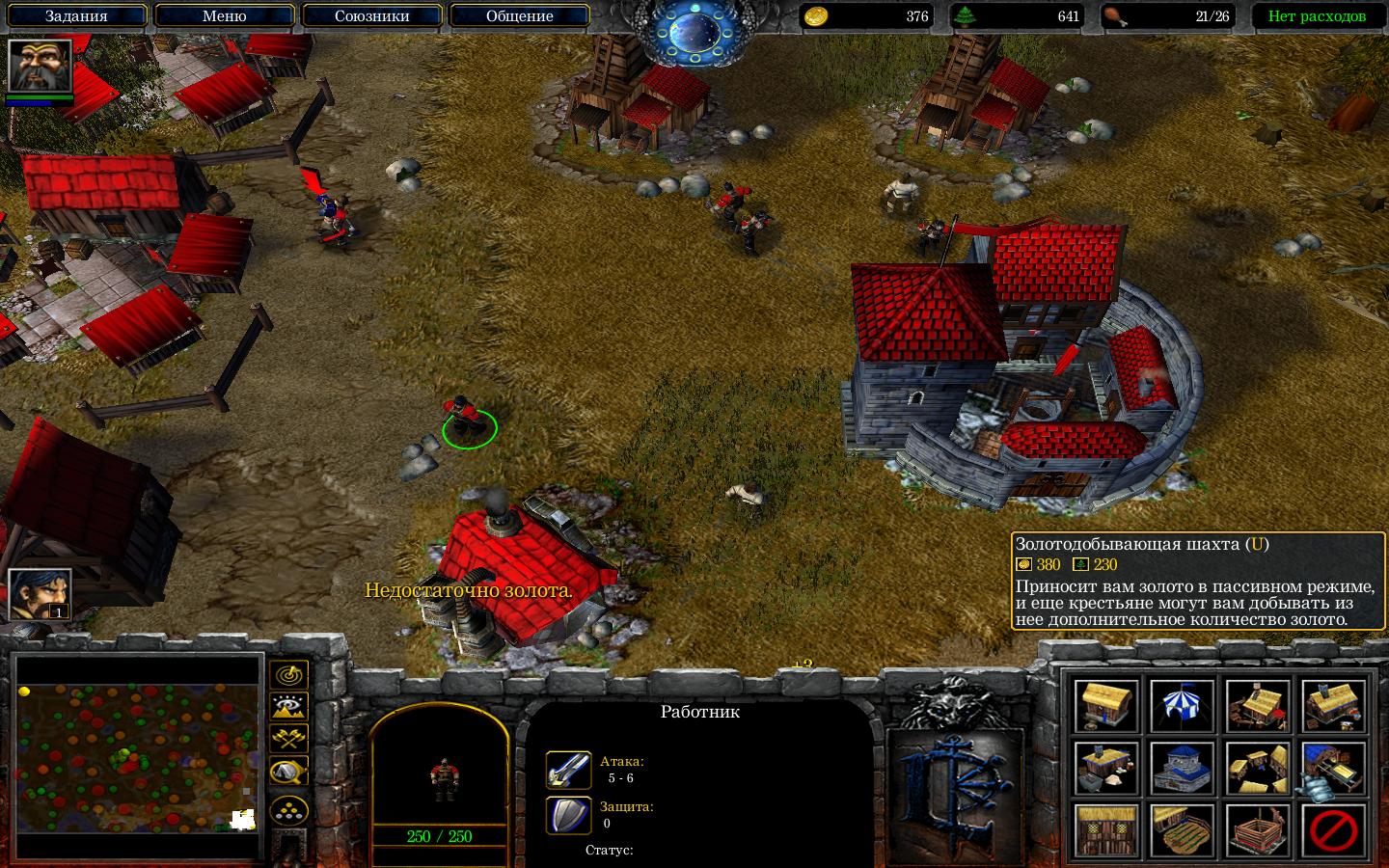 - Работник (Добывает золото и дерево, ремонтирует все, строит мирные постройки)