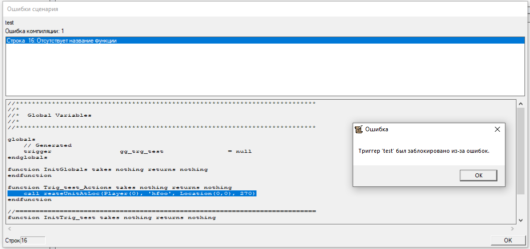 Здесь мы можем видеть название триггера ("test"), возможную причину ошибки ("Отсутствует название функции") и строчку кода, в котором была обнаружена ошибка ("call reateUnitAtLoc...").