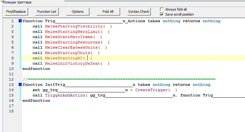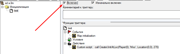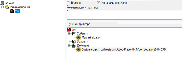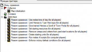 После всего перечисленного, обычный триггер будет преобразован в код. Для сравнения, я приведу пример с википедии, где был взят стартовый триггер с инициализацией сражения. Он создается реактором карт при создании карты, а мы его обычно удаляем, чтобы не появлялось главное здание, рабочие и т.д.