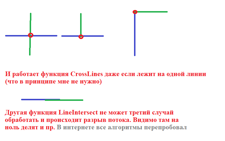 Функия проверяет отрезки на пересечения, если они пересекаются, то функция возвращяет true и устанавливает в глобалке точку пересечения.
