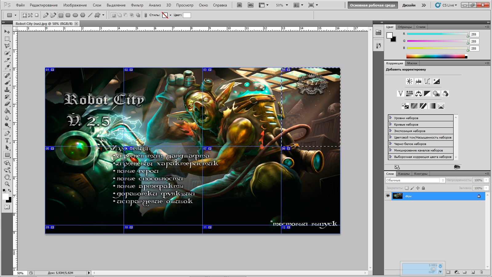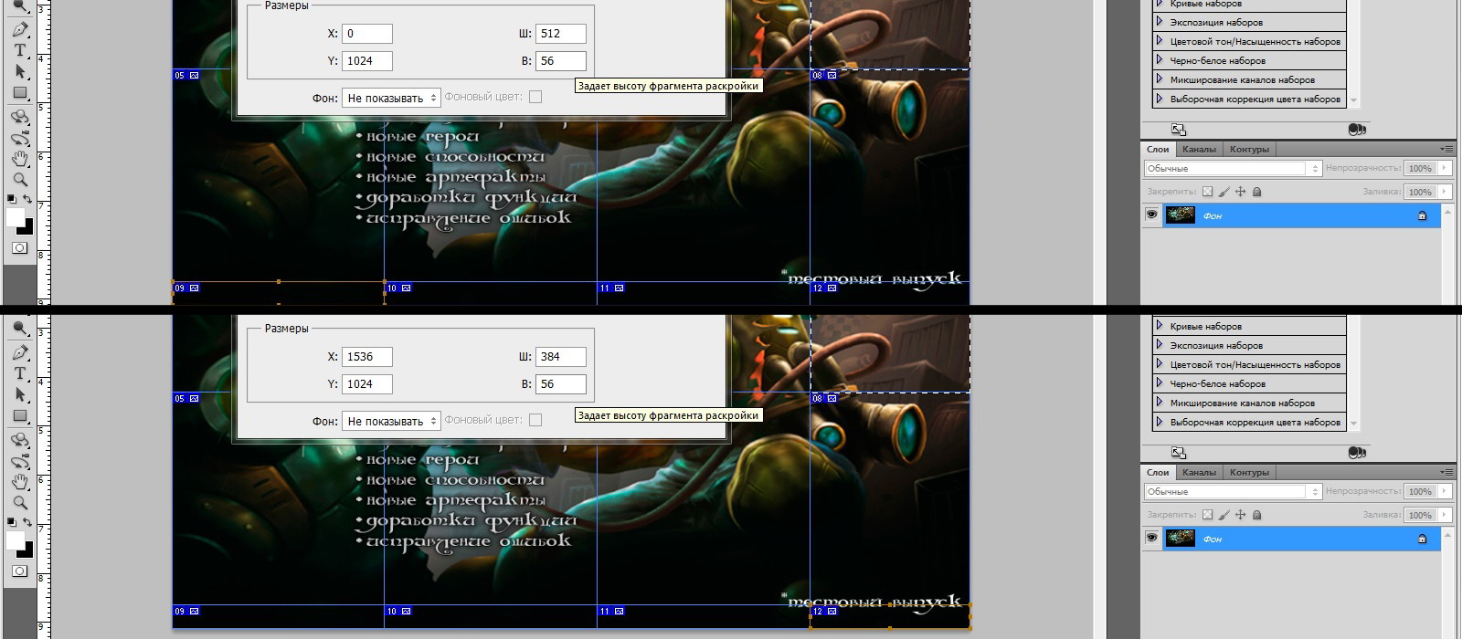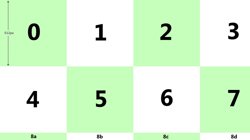 Установка как обычный формат, только делим картинку не на 4 части а на 12, с 1 по 7 по 512х512, а 8 по 512х256. Фрагменты 3 и 7 формата 384в ширину, так же фрагмент 8d получается 56 в высоту и 384 в ширину (всё остальное фон, 3 и 7 должны в итоге выйти 512х512, а 8d 512х56). Ниже всё поэтапно разберем.