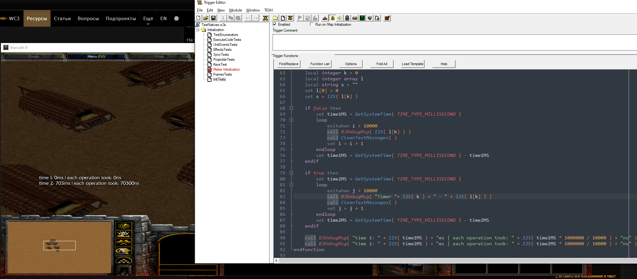 а дальше интересный момент - если в Loop1 заменить BJDebugMsg на DisplayTimedTextToPlayer, то количество итераций сразу вырастет с 800 до 9700 (потому что 1 BJDebugMsg это 12 раз DisplayTimedTextToPlayer, даже если в карте 2 слота для игроков)