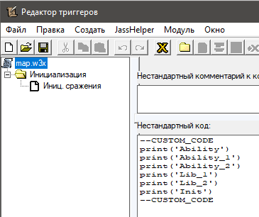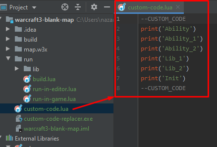 Важно! Сохраните карту в редакторе и закройте его, чтоб код попал в war3map.lua, при каждой последующей сборке он будет автоматически обновляться.