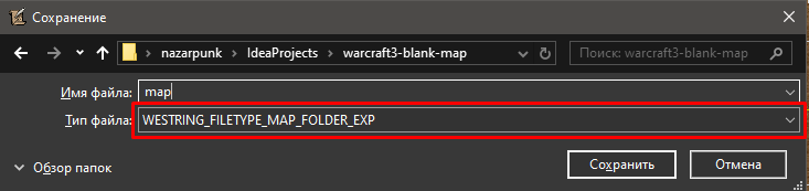 С картой нам придётся работать в режиме папки так что сохраним её в проэкт. Не забыв переключить в режим lua.