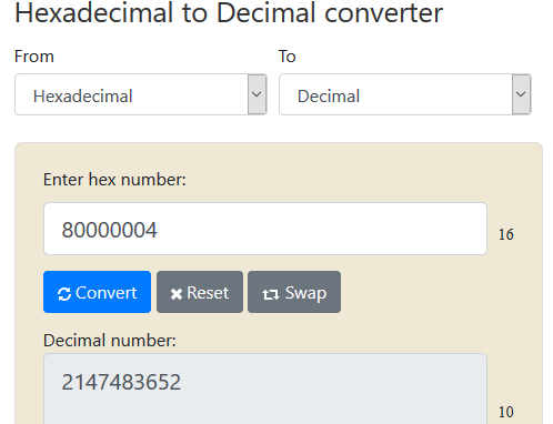 Как видно из статьи, в начале файла должно быть магическое число 0x80000004, а мы видим 04 00 00 80. Это потому что используется little-endian порядок байтов, тобишь байты идут в обратном порядке и читать их нужно таким образом 80 00 00 04. Покончив с теорией, извлечём из нашей таблицы bytes первые четыре элемента и записем их в строку: