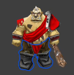 - Зеленокожий орк, в меховой шапке, сапогах и перчатках. На теле кожаная куртка. В броне предпочтительны серые, черные и серебряные цвета. В левой руке односторонний топор. За поясом небольшой кинжал.
