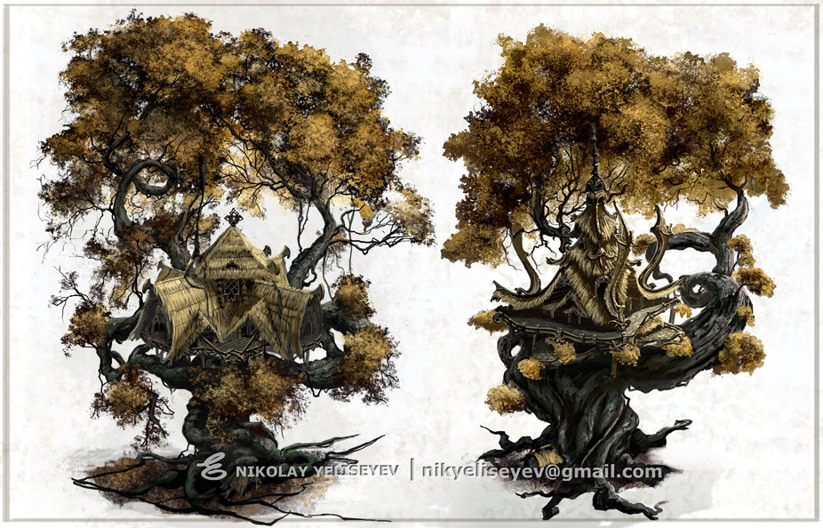 В общем по делу: нужна почти конкретно пять моделей обычного, большого дерева (не Древа!) (размером как Древо жизни ночных эльфов, только по выше)) и не ночных. Пять одинаковых с постепенно увеличивающимся числом зданий на древе(к стати можно и у корней дерева дома разместить)