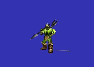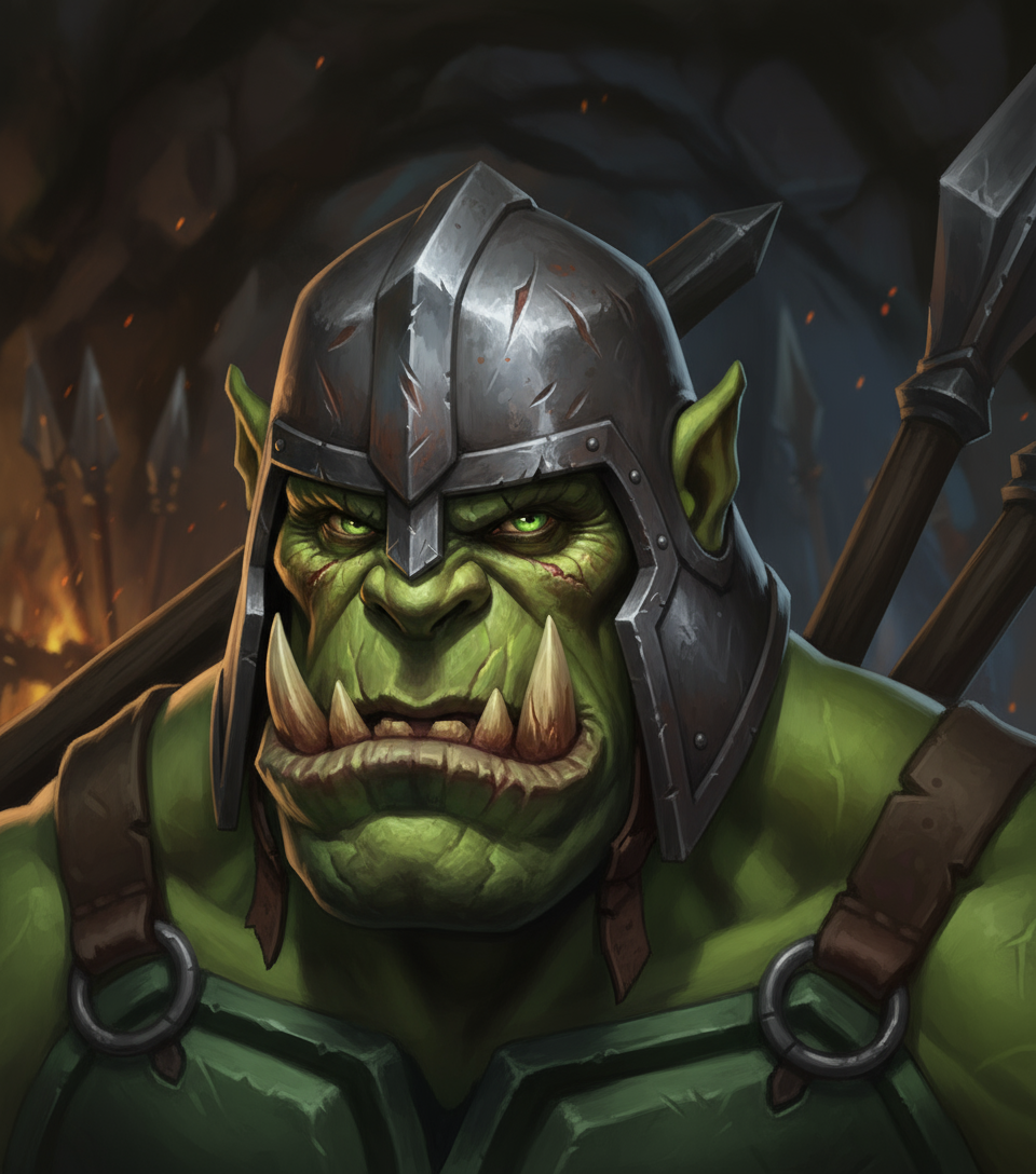 - Зеленокожий орк, в меховой шапке, сапогах и перчатках. На теле кожаная куртка. В броне предпочтительны серые, черные и серебряные цвета. В левой руке односторонний топор. За поясом небольшой кинжал.