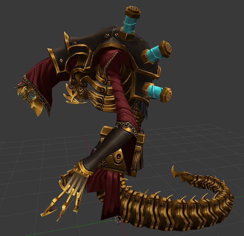 В первую очередь, освоим конвертирование неанимированных моделей, но и также попробуем поработать над моделями с анимациями. Сразу хочу предупредить, что чудес не бывает. Скиннинг в моделях делался ну совсем не под mdx, и полноценный перенос без допиливания руками практически невозможен. Чем сложнее скелет, тем хуже он перенесётся в варкрафт. Например, я долго сражался вот с этой нагаподобной моделью босса из Torchlight 2, но удовлетворительного результата получить не смог.