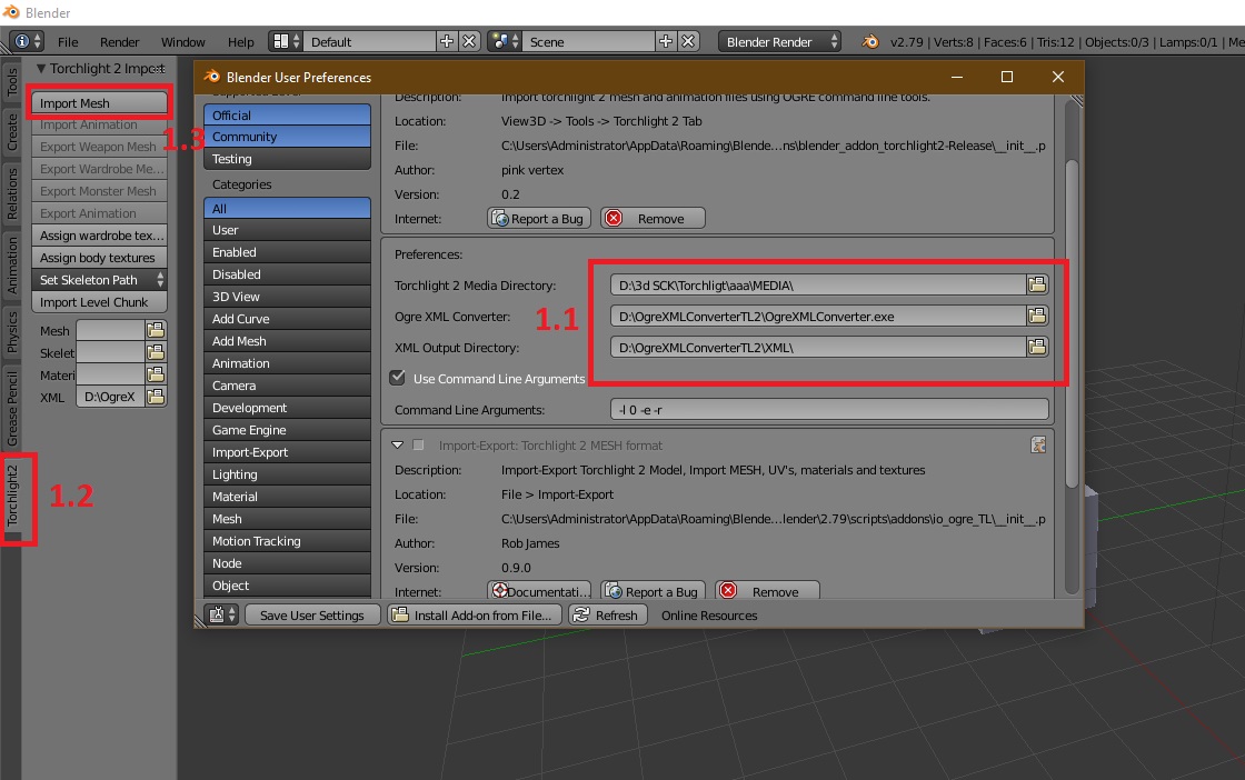 • Blender Addon Torchlight 2. Плагин для импорта .mesh и .skeleton файлов от pink-vertex. Скачать можно здесь или из архива, приложенного к статье. Установить по инструкции с гитхаба. В том числе, обязательно указать в настройках плагина в Блендере путь до OgreXMLConverter.exe. Есть альтернативная видеоинструкция по установке.