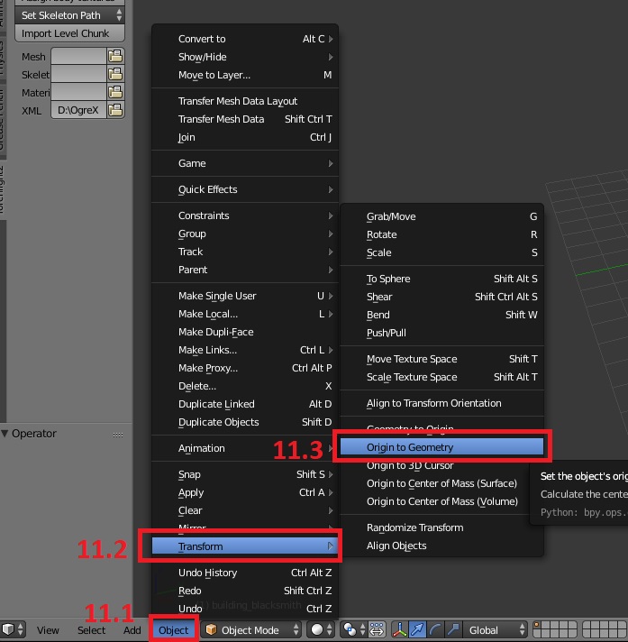 При этом, вернуть модель в центр сцены (перемещение клавишей G, поворот клавишей R и масштабирование клавишей S) очень затруднительно. Дело в том, что PivotPoints в моделях установлен на нулевую координату, а сам меш сдвинут. Полагаю, что это связано с расстановкой декораций в локациях. Лечится просто: Выделяем меш правой кнопкой мыши -> Object (11.1) -> Transform (11.2) -> Origin to Geometry (11.3). В других версиях Blender эта функция может находиться в другом месте.